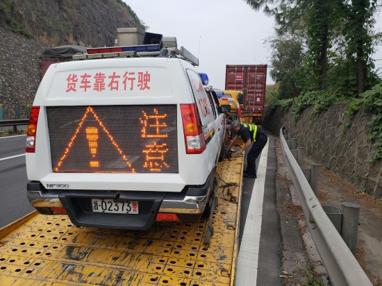 巧合的是,當(dāng)天下午四點(diǎn),這里曾在救援中幫助過施救中心的警車因?yàn)檩喬ス收希黄韧T趯幭螯S土嶺外的緊急停車帶上,又是兩人將該車平安救下高速。