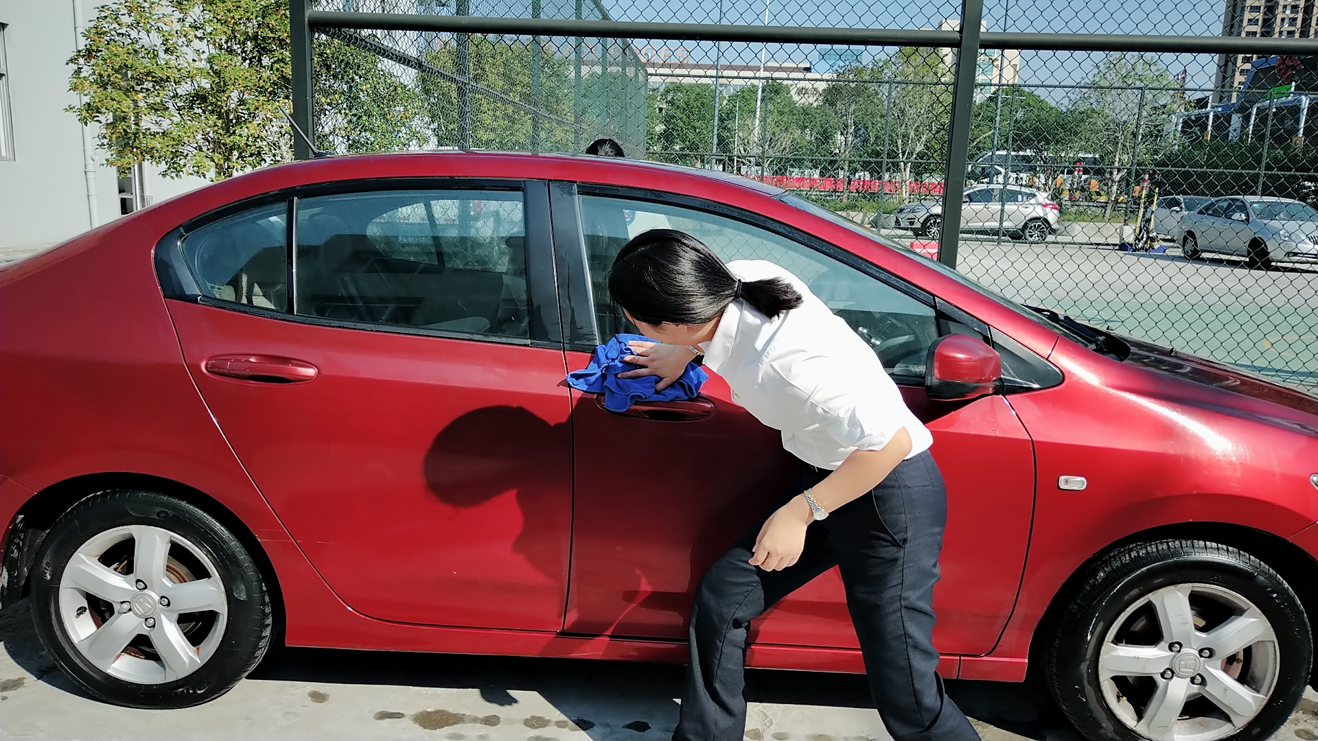 溫嶺西支部書記周超帶領(lǐng)黨員服務(wù)群眾 當(dāng)天上午,活動一開始,前來洗車的車輛絡(luò)繹不絕。在支部書記周超的帶領(lǐng)下,五名黨員便開始分工合作。兩名男同志負責(zé)沖水、上泡沫、擦洗、再沖水,兩名女同志負責(zé)擦干和吸塵器清掃內(nèi)室,還有一名男同志負責(zé)開車挪車,需要清洗的車輛一輛接著一輛,黨員同志們顧不得擦干身上的被水濺濕了的衣服,忙得不亦樂乎??粗幌吹靡粔m不染的車,大家都不約而同地會心一笑。