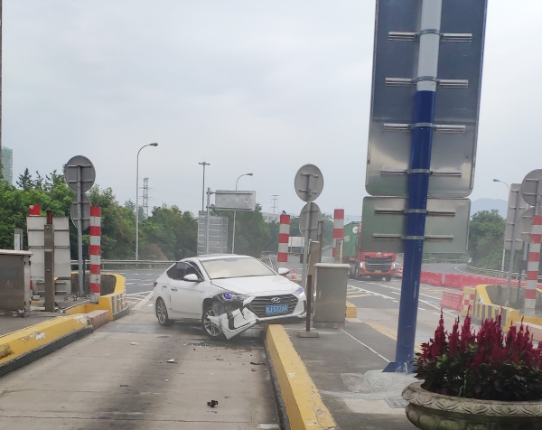 9月8日上午7點(diǎn)30分,一輛白色現(xiàn)代轎車在臺(tái)州收費(fèi)所出口準(zhǔn)備進(jìn)入ETC車道時(shí),突然撞向車道右側(cè)的全安島,在與安全島發(fā)生碰撞后,又一頭撞向了左側(cè)的安全島。 碰撞后的轎車半邊車身掛在了安全島上,車道上的光幕也因撞擊受損。收費(fèi)班長在聽到一聲巨響后,第一時(shí)間跑上前去查看情況。因?yàn)閯×业淖矒?/span>,轎車的右側(cè)已經(jīng)在地上灑落一堆碎片。坐在副駕駛的女士從車上下來查看車況,隨后男司機(jī)也從另一邊打開車門下來。所幸撞擊并未造成人員受傷。班長在確認(rèn)司機(jī)及乘客均無受傷后,一邊將事故報(bào)告監(jiān)控中心讓施救車輛前來救援,一邊提醒司機(jī)報(bào)警,人員站到安全島上方,不要隨意在車道上走動(dòng)。然后迅速跑到車道入口將水碼擋在車道口以防止有其他車輛誤入發(fā)生二次事故。