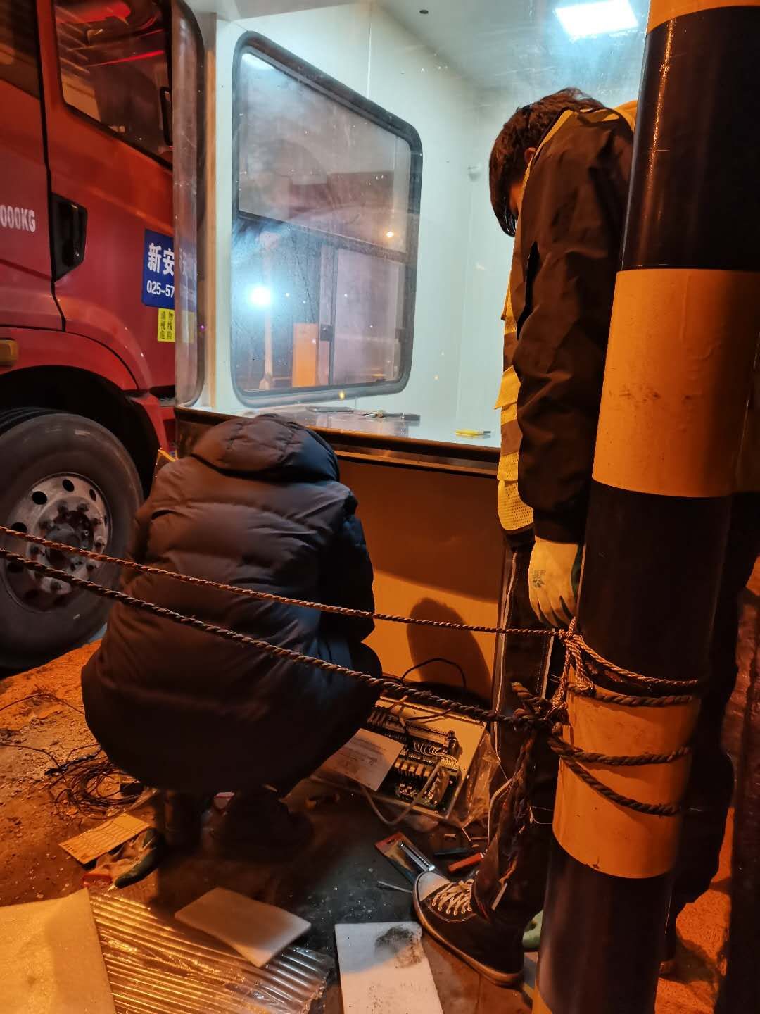 1月20日,公司董事長、總經理陳文波到收費所現場查看,要求加快速度抓緊搶修崗亭,重新安裝好各項設備設施,盡快開通車道。接到任務后,維養中心緊急召開會議討論,制定新崗亭安裝、設備調試方案。 21日下午4點左右,訂購的新崗亭和損壞的設備設施陸續到位,中心值班人員協同設備廠家一起將其安放并固定至車道原位置。因崗亭傾倒時拉斷了底下很多線纜,在拆除設備時又因為緊急搶修需要沒有作相應標注,現場各種電線接頭雜亂如麻。考慮到夜間查線、接線存在一定的安全隱患,也不利于施工,搶修人員決定第二天再戰。