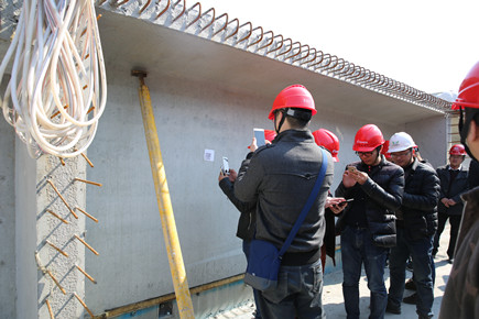 在該項(xiàng)目三分部鋼筋加工廠和T梁預(yù)制廠的現(xiàn)場(chǎng),騰達(dá)建設(shè)集團(tuán)公司副總經(jīng)理蔣冬湖向來訪者詳細(xì)講解了鋼筋標(biāo)準(zhǔn)化制作工藝、智能彎箍住焊接機(jī)、箱式梯籠、智能噴淋養(yǎng)護(hù)等施工特色及亮點(diǎn),并現(xiàn)場(chǎng)向觀摩人員展示了施工全過程二維碼控制,只要用掃一掃構(gòu)件上的二維碼,該構(gòu)件所有相關(guān)的施工信息馬上就能一目了然的在手機(jī)上呈現(xiàn),實(shí)現(xiàn)了施工過程中的信息化管理及全過程監(jiān)控。觀摩人員一邊認(rèn)真聽介紹,一邊不時(shí)拿起手機(jī)拍攝記錄下一些自己感興趣的突破資料,并與同行不斷交流著各自的經(jīng)驗(yàn)與心得。